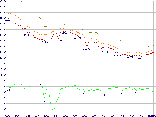 ※このグラフは過去のデータも税率5%相当に調整した税込み相当額のグラフです。 税率変更や、総額表示方式導入(2004年4月)の影響は除いています。 | | | ●凡例 | 最安値 (点線部は販売店未確認 または未調査) | 平均値 | 最高値 | ショップ数 |