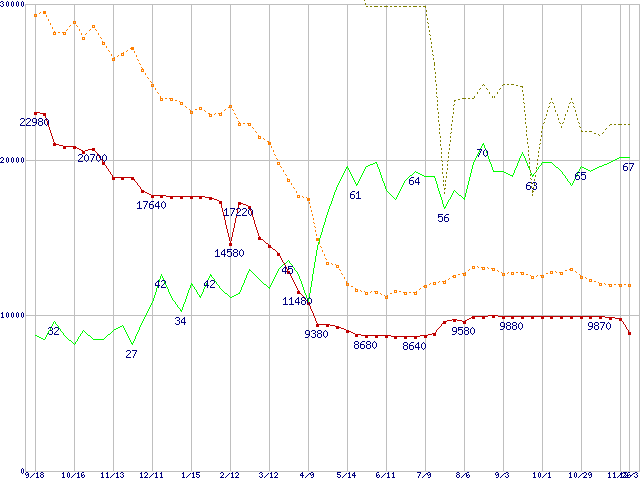 ※このグラフは過去のデータも税率5%相当に調整した税込み相当額のグラフです。 税率変更や、総額表示方式導入(2004年4月)の影響は除いています。 | | | ●凡例 | 最安値 (点線部は販売店未確認 または未調査) | 平均値 | 最高値 | ショップ数 |