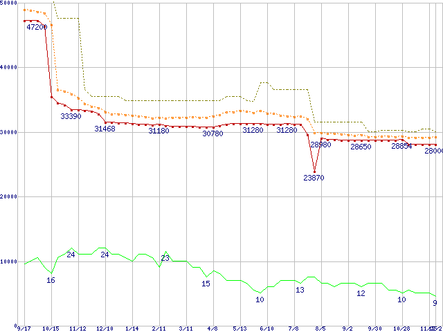 ※このグラフは過去のデータも税率5%相当に調整した税込み相当額のグラフです。 税率変更や、総額表示方式導入(2004年4月)の影響は除いています。 | | | ●凡例 | 最安値 (点線部は販売店未確認 または未調査) | 平均値 | 最高値 | ショップ数 |