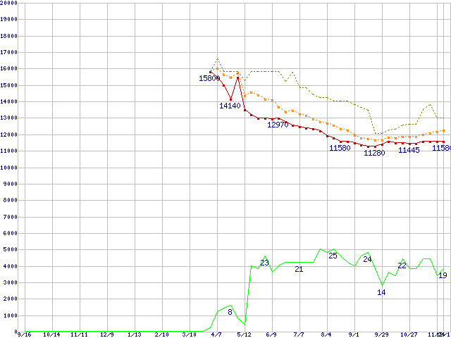 ※このグラフは過去のデータも税率5%相当に調整した税込み相当額のグラフです。 税率変更や、総額表示方式導入(2004年4月)の影響は除いています。 | | | ●凡例 | 最安値 (点線部は販売店未確認 または未調査) | 平均値 | 最高値 | ショップ数 |