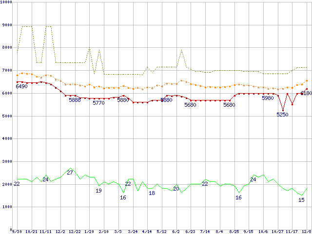 ※このグラフは過去のデータも税率5%相当に調整した税込み相当額のグラフです。 税率変更や、総額表示方式導入(2004年4月)の影響は除いています。 | | | ●凡例 | 最安値 (点線部は販売店未確認 または未調査) | 平均値 | 最高値 | ショップ数 |