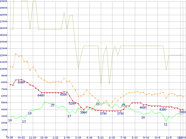 ※このグラフは過去のデータも税率5%相当に調整した税込み相当額のグラフです。 税率変更や、総額表示方式導入(2004年4月)の影響は除いています。 | | | ●凡例 | 最安値 (点線部は販売店未確認 または未調査) | 平均値 | 最高値 | ショップ数 |