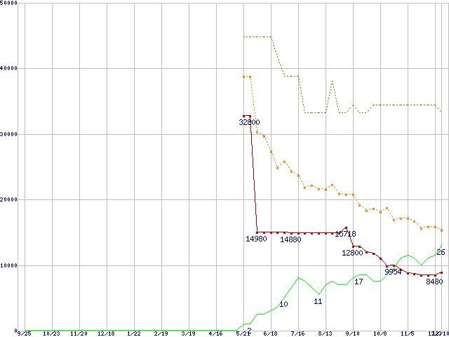 ※このグラフは過去のデータも税率5%相当に調整した税込み相当額のグラフです。 税率変更や、総額表示方式導入(2004年4月)の影響は除いています。 | | | ●凡例 | 最安値 (点線部は販売店未確認 または未調査) | 平均値 | 最高値 | ショップ数 |