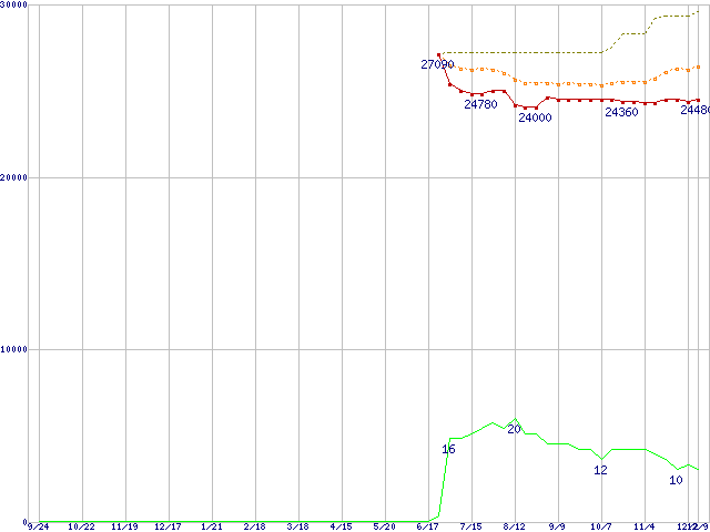 ※このグラフは過去のデータも税率5%相当に調整した税込み相当額のグラフです。 税率変更や、総額表示方式導入(2004年4月)の影響は除いています。 | | | ●凡例 | 最安値 (点線部は販売店未確認 または未調査) | 平均値 | 最高値 | ショップ数 |