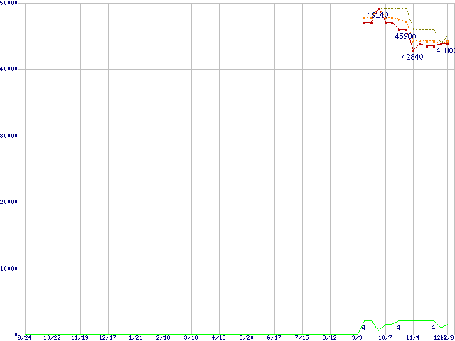 ※このグラフは過去のデータも税率5%相当に調整した税込み相当額のグラフです。 税率変更や、総額表示方式導入(2004年4月)の影響は除いています。 | | | ●凡例 | 最安値 (点線部は販売店未確認 または未調査) | 平均値 | 最高値 | ショップ数 |