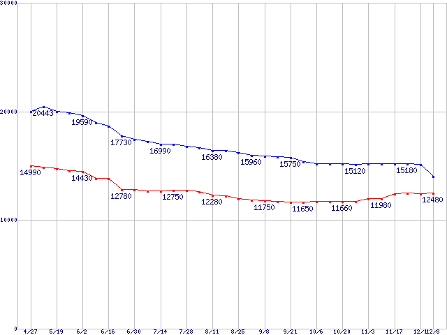 | MaXLine III (7200rpm,16MB,Ultra ATA/133,RoHS指令準拠)の最安値推移 | | | (2005年4月27日~2005年12月8日) |