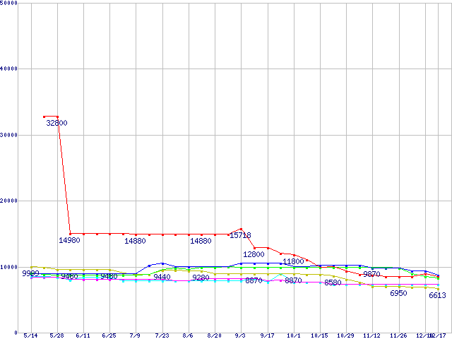 メモリ主要製品(最安値1万円以上)の最安値推移