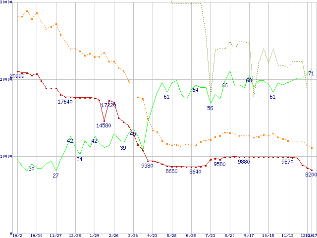 ※このグラフは過去のデータも税率5%相当に調整した税込み相当額のグラフです。 税率変更や、総額表示方式導入(2004年4月)の影響は除いています。 | | | ●凡例 | 最安値 (点線部は販売店未確認 または未調査) | 平均値 | 最高値 | ショップ数 |