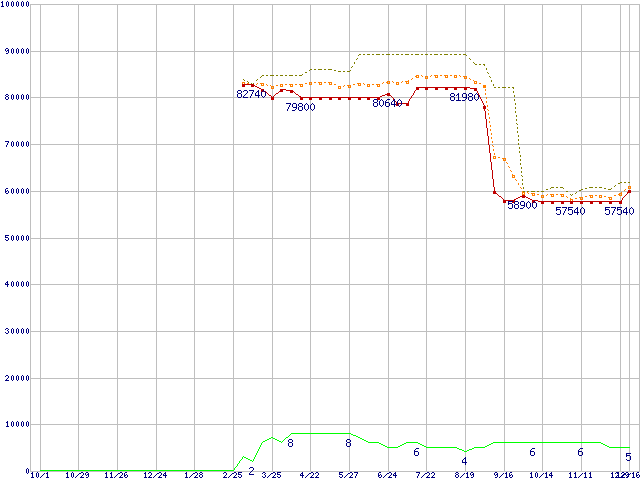 ※このグラフは過去のデータも税率5%相当に調整した税込み相当額のグラフです。 税率変更や、総額表示方式導入(2004年4月)の影響は除いています。 | | | ●凡例 | 最安値 (点線部は販売店未確認 または未調査) | 平均値 | 最高値 | ショップ数 |