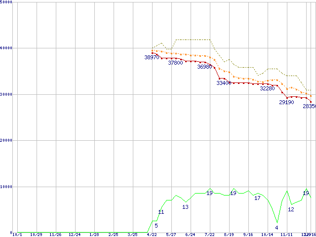 | Athlon 64 3700+ (2.2GHz,L2 1MB)の価格推移 | | | (2004年10月1日~2005年12月16日) |