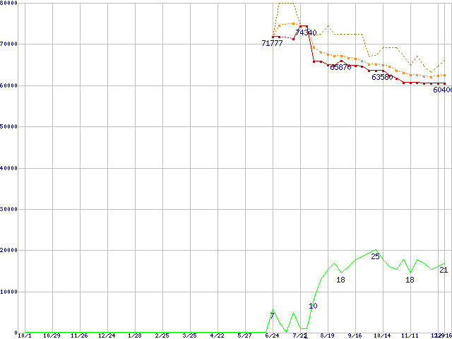 ※このグラフは過去のデータも税率5%相当に調整した税込み相当額のグラフです。 税率変更や、総額表示方式導入(2004年4月)の影響は除いています。 | | | ●凡例 | 最安値 (点線部は販売店未確認 または未調査) | 平均値 | 最高値 | ショップ数 |