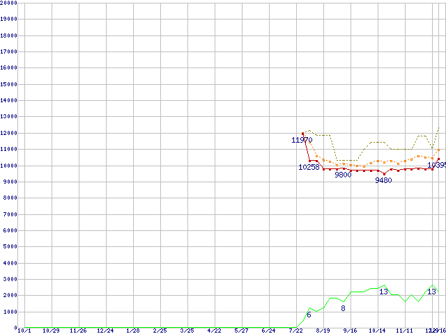 ※このグラフは過去のデータも税率5%相当に調整した税込み相当額のグラフです。 税率変更や、総額表示方式導入(2004年4月)の影響は除いています。 | | | ●凡例 | 最安値 (点線部は販売店未確認 または未調査) | 平均値 | 最高値 | ショップ数 |