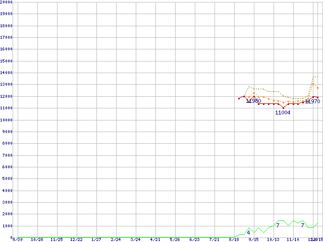 ※このグラフは過去のデータも税率5%相当に調整した税込み相当額のグラフです。 税率変更や、総額表示方式導入(2004年4月)の影響は除いています。 | | | ●凡例 | 最安値 (点線部は販売店未確認 または未調査) | 平均値 | 最高値 | ショップ数 |