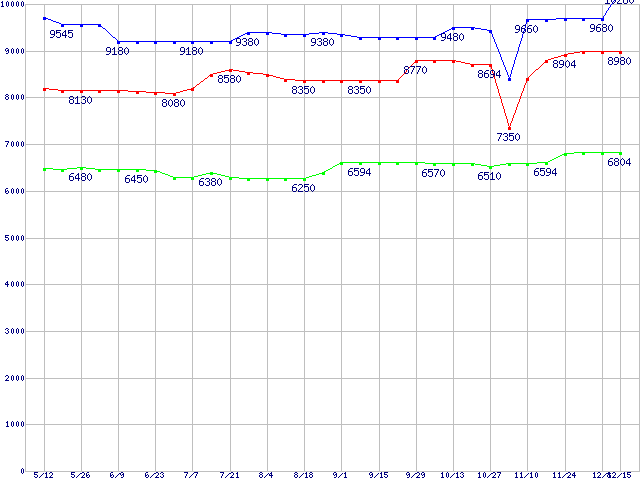 | Barracuda 7200.7 SATA (7200rpm,Serial ATA,NCQ,8MB,80GB/Platter)の最安値推移 | | | (2005年5月12日~2005年12月15日) |