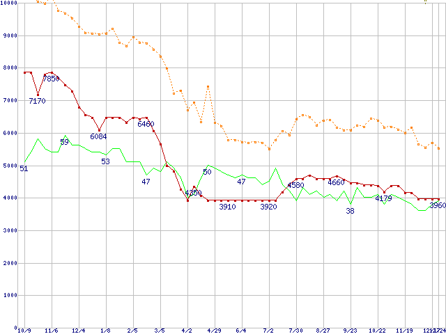 ※このグラフは過去のデータも税率5%相当に調整した税込み相当額のグラフです。 税率変更や、総額表示方式導入(2004年4月)の影響は除いています。 | | | ●凡例 | 最安値 (点線部は販売店未確認 または未調査) | 平均値 | 最高値 | ショップ数 |