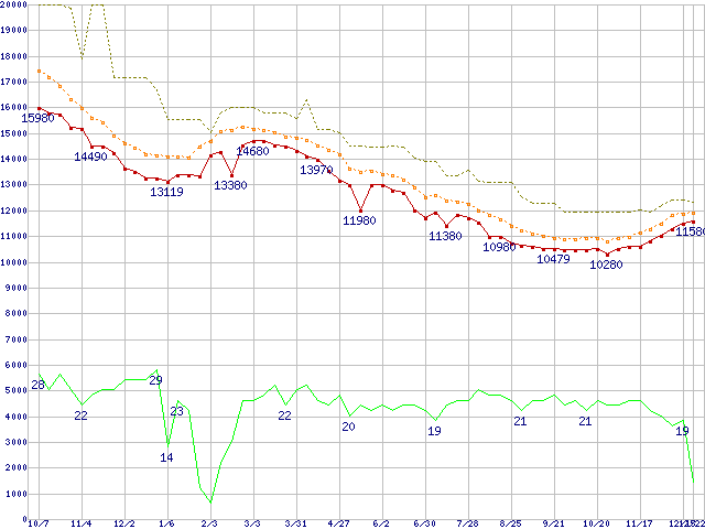 ※このグラフは過去のデータも税率5%相当に調整した税込み相当額のグラフです。 税率変更や、総額表示方式導入(2004年4月)の影響は除いています。 | | | ●凡例 | 最安値 (点線部は販売店未確認 または未調査) | 平均値 | 最高値 | ショップ数 |