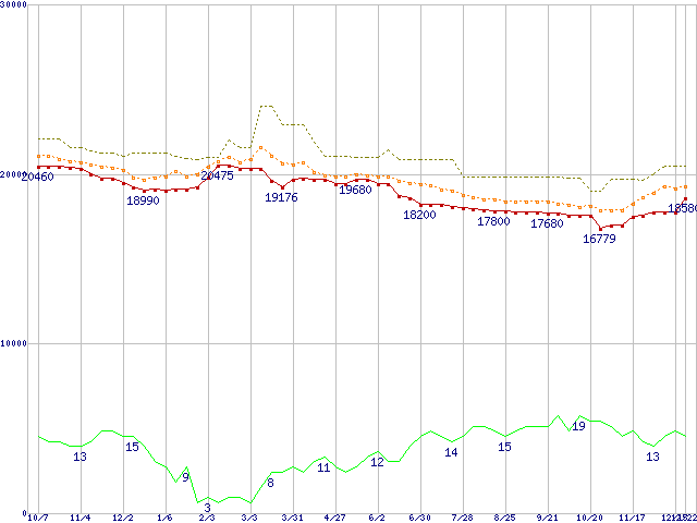 ※このグラフは過去のデータも税率5%相当に調整した税込み相当額のグラフです。 税率変更や、総額表示方式導入(2004年4月)の影響は除いています。 | | | ●凡例 | 最安値 (点線部は販売店未確認 または未調査) | 平均値 | 最高値 | ショップ数 |