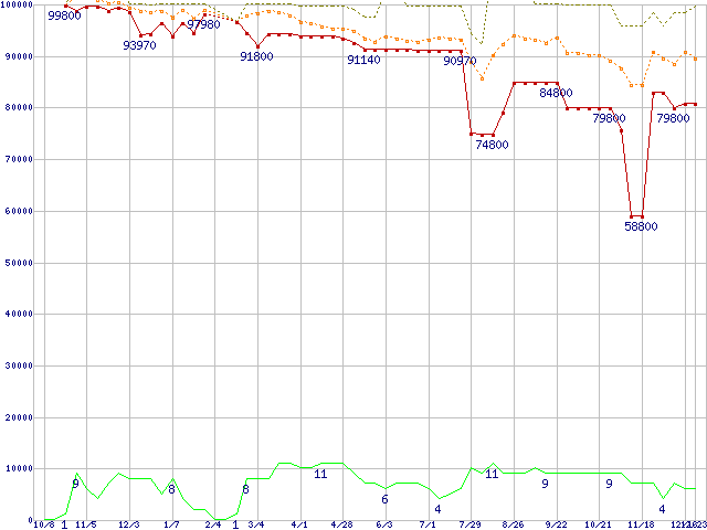 ※このグラフは過去のデータも税率5%相当に調整した税込み相当額のグラフです。 税率変更や、総額表示方式導入(2004年4月)の影響は除いています。 | | | ●凡例 | 最安値 (点線部は販売店未確認 または未調査) | 平均値 | 最高値 | ショップ数 |