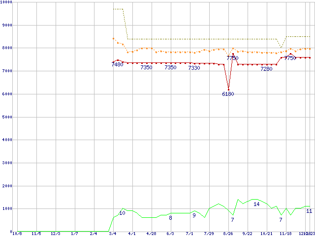 ※このグラフは過去のデータも税率5%相当に調整した税込み相当額のグラフです。 税率変更や、総額表示方式導入(2004年4月)の影響は除いています。 | | | ●凡例 | 最安値 (点線部は販売店未確認 または未調査) | 平均値 | 最高値 | ショップ数 |