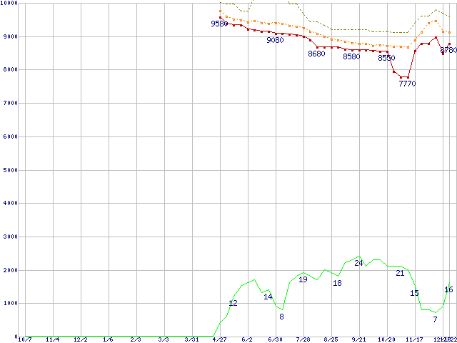 ※このグラフは過去のデータも税率5%相当に調整した税込み相当額のグラフです。 税率変更や、総額表示方式導入(2004年4月)の影響は除いています。 | | | ●凡例 | 最安値 (点線部は販売店未確認 または未調査) | 平均値 | 最高値 | ショップ数 |