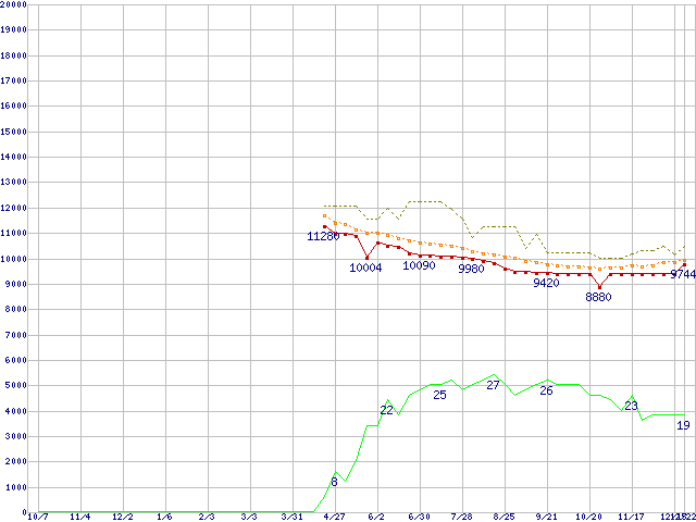 ※このグラフは過去のデータも税率5%相当に調整した税込み相当額のグラフです。 税率変更や、総額表示方式導入(2004年4月)の影響は除いています。 | | | ●凡例 | 最安値 (点線部は販売店未確認 または未調査) | 平均値 | 最高値 | ショップ数 |