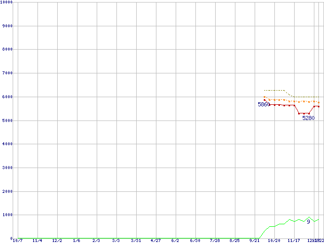 ※このグラフは過去のデータも税率5%相当に調整した税込み相当額のグラフです。 税率変更や、総額表示方式導入(2004年4月)の影響は除いています。 | | | ●凡例 | 最安値 (点線部は販売店未確認 または未調査) | 平均値 | 最高値 | ショップ数 |
