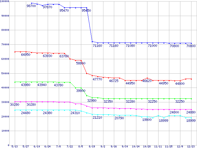 | LGA 775 (FSB 800MHz,L2 2MB,Hyper-Threading,EM64T対応)の最安値推移 | | | (2005年5月13日~2005年12月23日) |