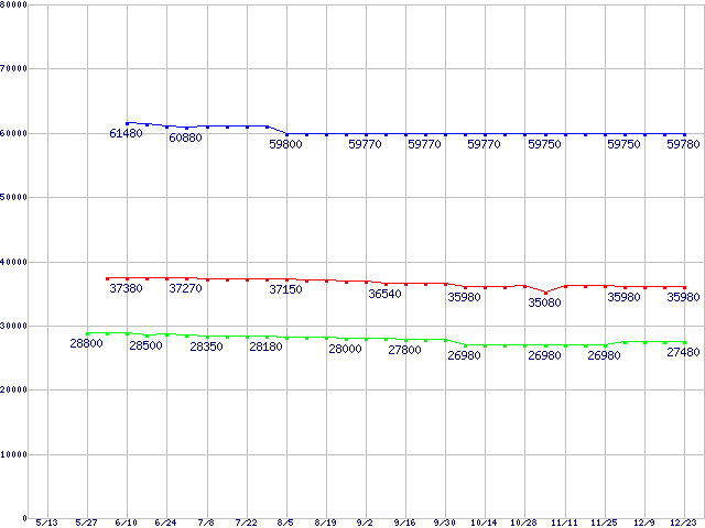 | LGA 775 (FSB 800MHz,L2 1MB×2,Dual Core,EM64T対応)の最安値推移 | | | (2005年5月13日~2005年12月23日) |