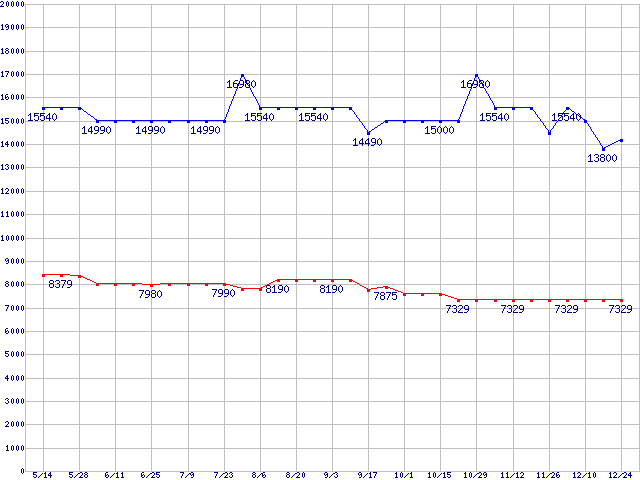| PC3200(DDR400) DDR SDRAM DIMM ECC対応 Registeredタイプの最安値推移 | | | (2005年5月14日~2005年12月24日) |