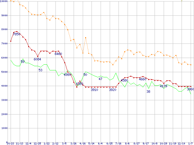 ※このグラフは過去のデータも税率5%相当に調整した税込み相当額のグラフです。 税率変更や、総額表示方式導入(2004年4月)の影響は除いています。 | | | ●凡例 | 最安値 (点線部は販売店未確認 または未調査) | 平均値 | 最高値 | ショップ数 |