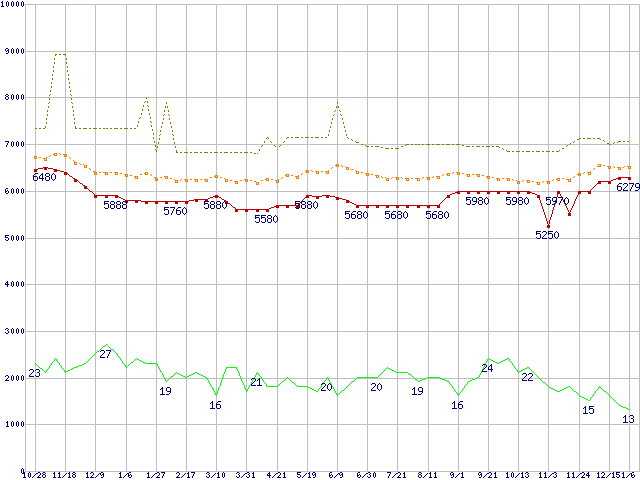 ※このグラフは過去のデータも税率5%相当に調整した税込み相当額のグラフです。 税率変更や、総額表示方式導入(2004年4月)の影響は除いています。 | | | ●凡例 | 最安値 (点線部は販売店未確認 または未調査) | 平均値 | 最高値 | ショップ数 |