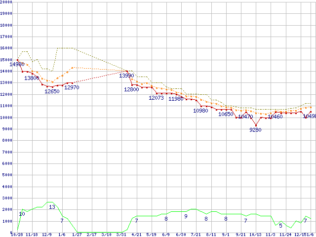※このグラフは過去のデータも税率5%相当に調整した税込み相当額のグラフです。 税率変更や、総額表示方式導入(2004年4月)の影響は除いています。 | | | ●凡例 | 最安値 (点線部は販売店未確認 または未調査) | 平均値 | 最高値 | ショップ数 |