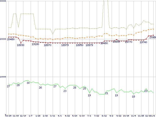 ※このグラフは過去のデータも税率5%相当に調整した税込み相当額のグラフです。 税率変更や、総額表示方式導入(2004年4月)の影響は除いています。 | | | ●凡例 | 最安値 (点線部は販売店未確認 または未調査) | 平均値 | 最高値 | ショップ数 |