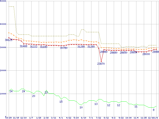 ※このグラフは過去のデータも税率5%相当に調整した税込み相当額のグラフです。 税率変更や、総額表示方式導入(2004年4月)の影響は除いています。 | | | ●凡例 | 最安値 (点線部は販売店未確認 または未調査) | 平均値 | 最高値 | ショップ数 |