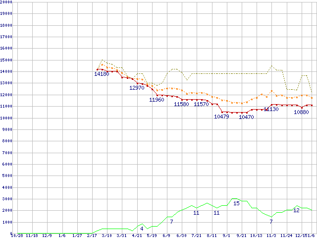 ※このグラフは過去のデータも税率5%相当に調整した税込み相当額のグラフです。 税率変更や、総額表示方式導入(2004年4月)の影響は除いています。 | | | ●凡例 | 最安値 (点線部は販売店未確認 または未調査) | 平均値 | 最高値 | ショップ数 |