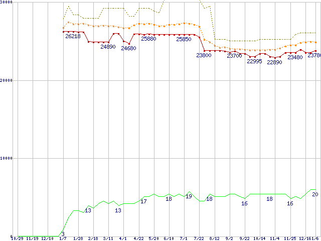 ※このグラフは過去のデータも税率5%相当に調整した税込み相当額のグラフです。 税率変更や、総額表示方式導入(2004年4月)の影響は除いています。 | | | ●凡例 | 最安値 (点線部は販売店未確認 または未調査) | 平均値 | 最高値 | ショップ数 |