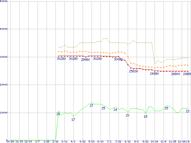 ※このグラフは過去のデータも税率5%相当に調整した税込み相当額のグラフです。 税率変更や、総額表示方式導入(2004年4月)の影響は除いています。 | | | ●凡例 | 最安値 (点線部は販売店未確認 または未調査) | 平均値 | 最高値 | ショップ数 |
