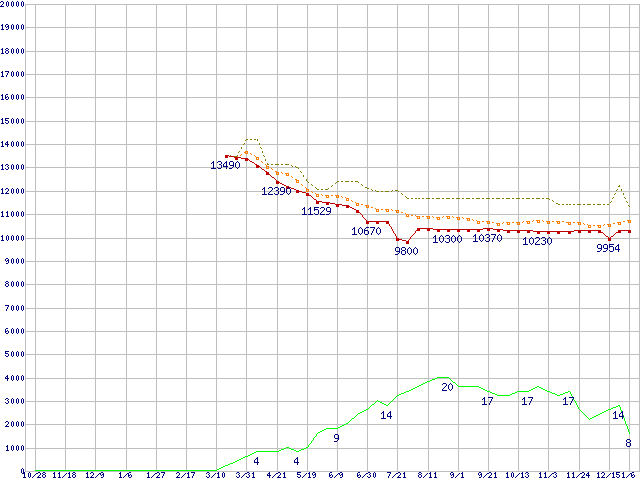 ※このグラフは過去のデータも税率5%相当に調整した税込み相当額のグラフです。 税率変更や、総額表示方式導入(2004年4月)の影響は除いています。 | | | ●凡例 | 最安値 (点線部は販売店未確認 または未調査) | 平均値 | 最高値 | ショップ数 |