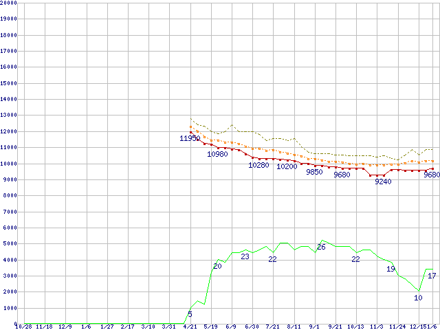 ※このグラフは過去のデータも税率5%相当に調整した税込み相当額のグラフです。 税率変更や、総額表示方式導入(2004年4月)の影響は除いています。 | | | ●凡例 | 最安値 (点線部は販売店未確認 または未調査) | 平均値 | 最高値 | ショップ数 |