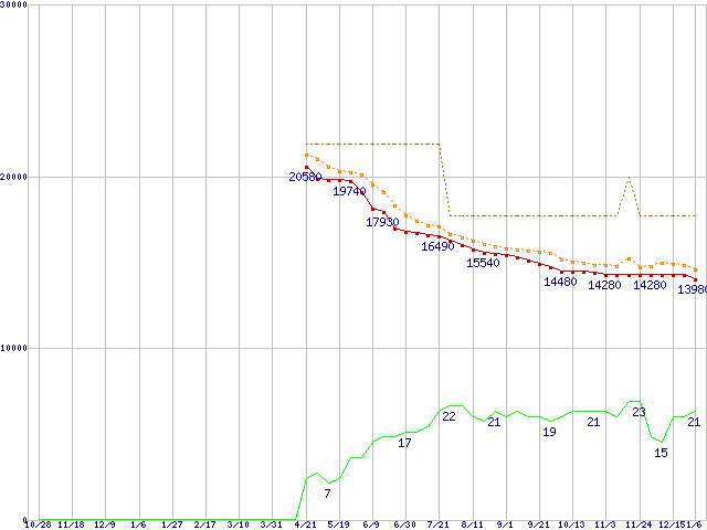 ※このグラフは過去のデータも税率5%相当に調整した税込み相当額のグラフです。 税率変更や、総額表示方式導入(2004年4月)の影響は除いています。 | | | ●凡例 | 最安値 (点線部は販売店未確認 または未調査) | 平均値 | 最高値 | ショップ数 |