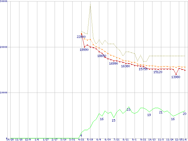 ※このグラフは過去のデータも税率5%相当に調整した税込み相当額のグラフです。 税率変更や、総額表示方式導入(2004年4月)の影響は除いています。 | | | ●凡例 | 最安値 (点線部は販売店未確認 または未調査) | 平均値 | 最高値 | ショップ数 |