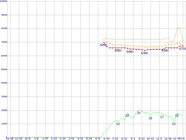 ※このグラフは過去のデータも税率5%相当に調整した税込み相当額のグラフです。 税率変更や、総額表示方式導入(2004年4月)の影響は除いています。 | | | ●凡例 | 最安値 (点線部は販売店未確認 または未調査) | 平均値 | 最高値 | ショップ数 |