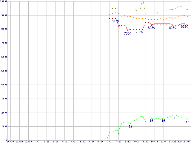 ※このグラフは過去のデータも税率5%相当に調整した税込み相当額のグラフです。 税率変更や、総額表示方式導入(2004年4月)の影響は除いています。 | | | ●凡例 | 最安値 (点線部は販売店未確認 または未調査) | 平均値 | 最高値 | ショップ数 |