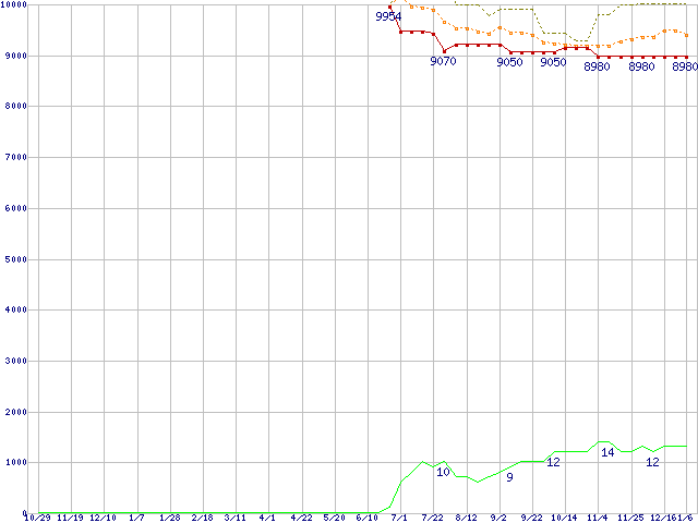 ※このグラフは過去のデータも税率5%相当に調整した税込み相当額のグラフです。 税率変更や、総額表示方式導入(2004年4月)の影響は除いています。 | | | ●凡例 | 最安値 (点線部は販売店未確認 または未調査) | 平均値 | 最高値 | ショップ数 |