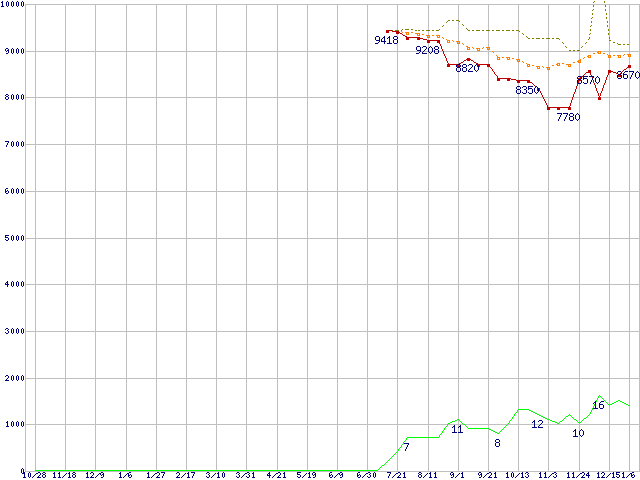 ※このグラフは過去のデータも税率5%相当に調整した税込み相当額のグラフです。 税率変更や、総額表示方式導入(2004年4月)の影響は除いています。 | | | ●凡例 | 最安値 (点線部は販売店未確認 または未調査) | 平均値 | 最高値 | ショップ数 |