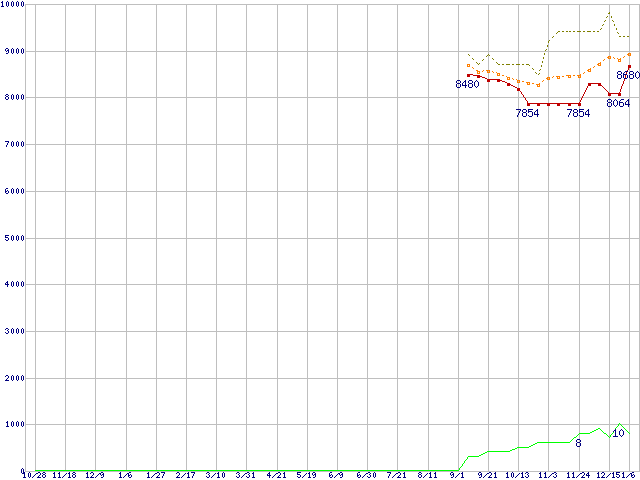 ※このグラフは過去のデータも税率5%相当に調整した税込み相当額のグラフです。 税率変更や、総額表示方式導入(2004年4月)の影響は除いています。 | | | ●凡例 | 最安値 (点線部は販売店未確認 または未調査) | 平均値 | 最高値 | ショップ数 |