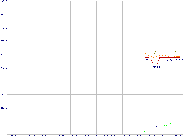 ※このグラフは過去のデータも税率5%相当に調整した税込み相当額のグラフです。 税率変更や、総額表示方式導入(2004年4月)の影響は除いています。 | | | ●凡例 | 最安値 (点線部は販売店未確認 または未調査) | 平均値 | 最高値 | ショップ数 |