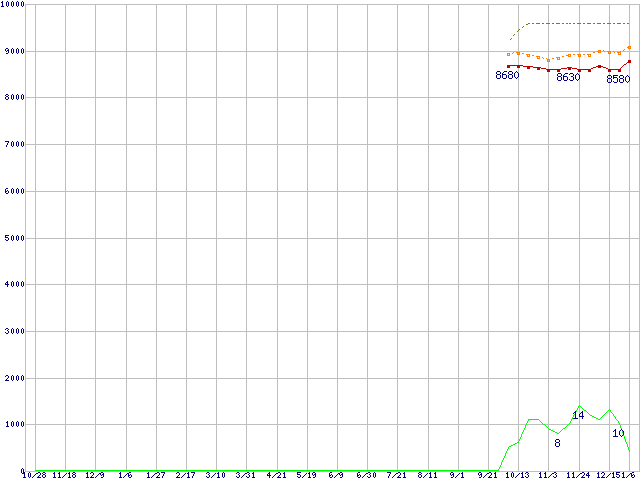 ※このグラフは過去のデータも税率5%相当に調整した税込み相当額のグラフです。 税率変更や、総額表示方式導入(2004年4月)の影響は除いています。 | | | ●凡例 | 最安値 (点線部は販売店未確認 または未調査) | 平均値 | 最高値 | ショップ数 |