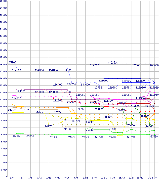 CPU主要製品(最安値6万円以上)の最安値推移