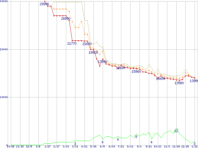 ※このグラフは過去のデータも税率5%相当に調整した税込み相当額のグラフです。 税率変更や、総額表示方式導入(2004年4月)の影響は除いています。 | | | ●凡例 | 最安値 (点線部は販売店未確認 または未調査) | 平均値 | 最高値 | ショップ数 |